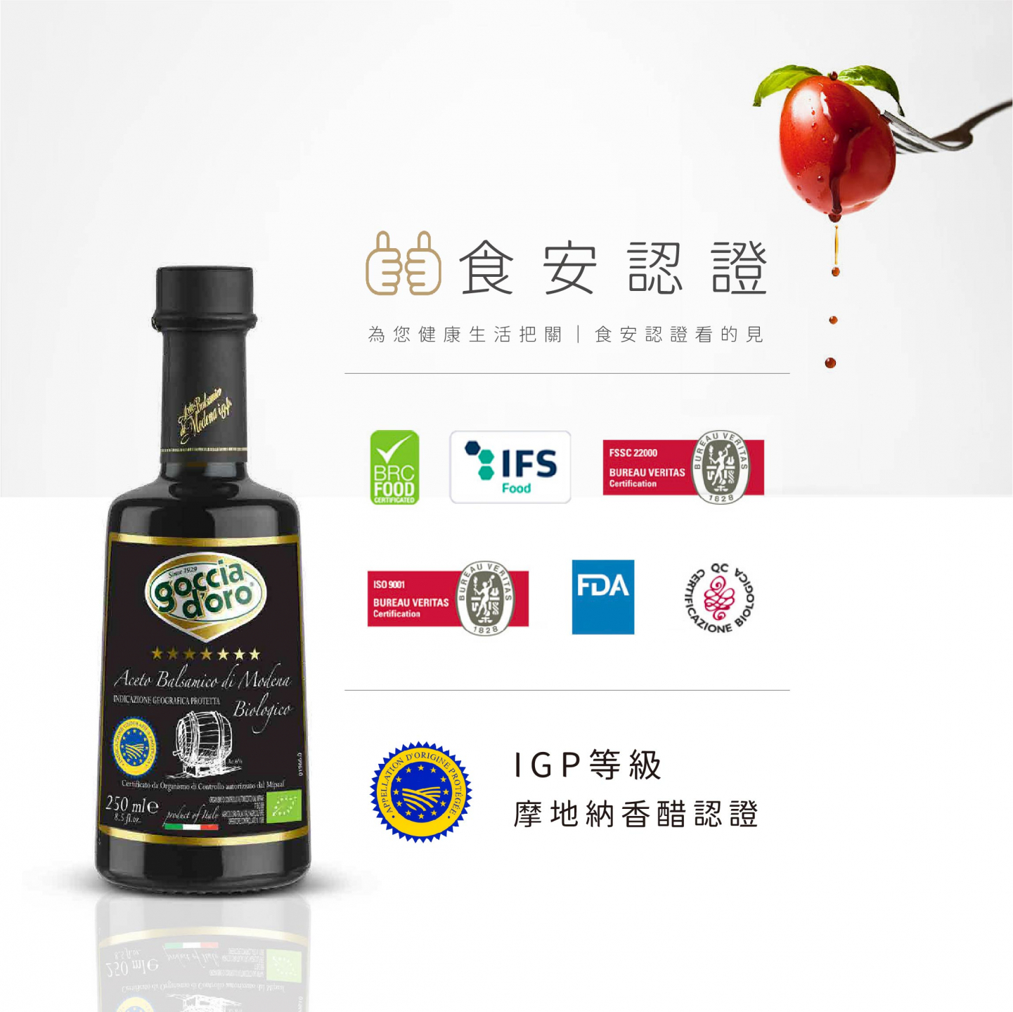 來自有機葡萄的摩德納義式有機香醋非常適合搭配精緻的義大利調味飯和肉類或蔬菜醬汁的第一道菜。更是搭配紅肉和白肉的完美組合。本產品質地更為濃縮,口感豐富,提升食物的鮮美的義式佐料。