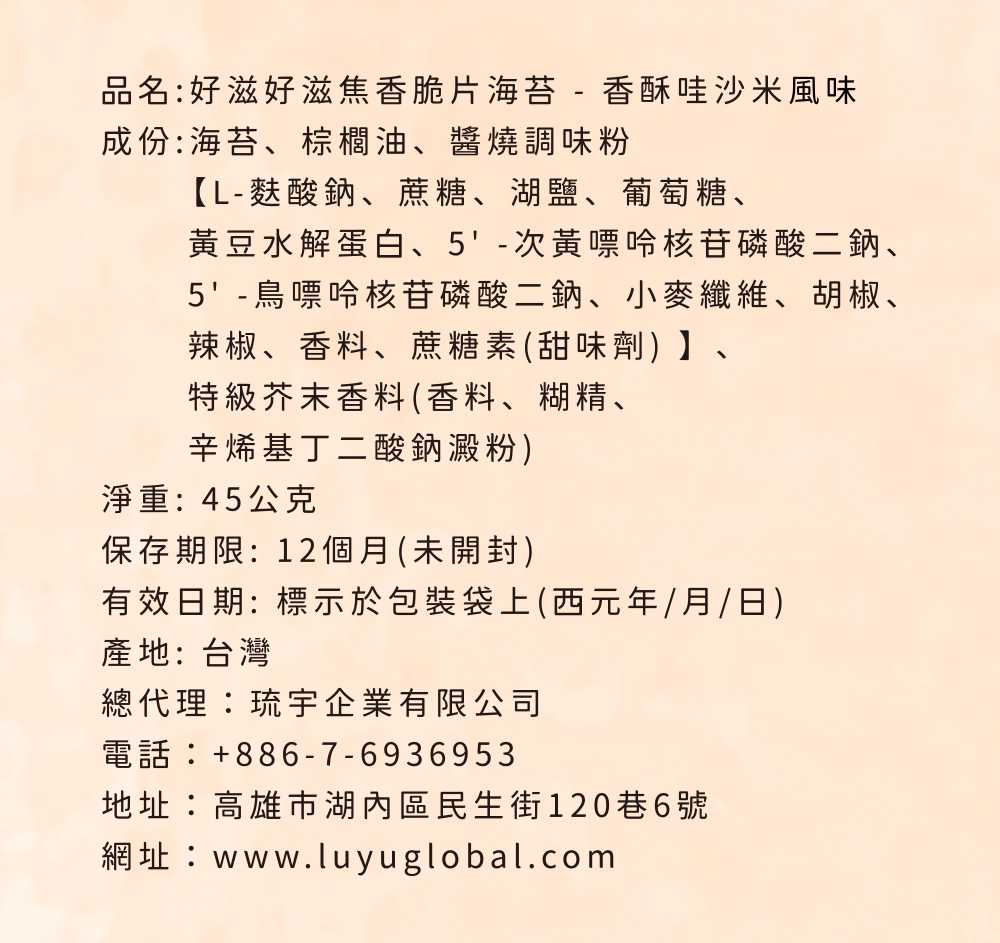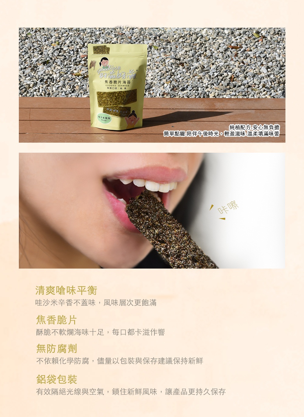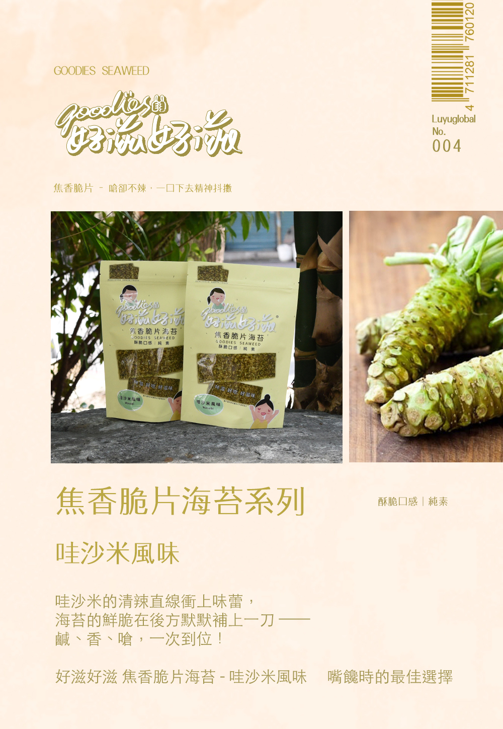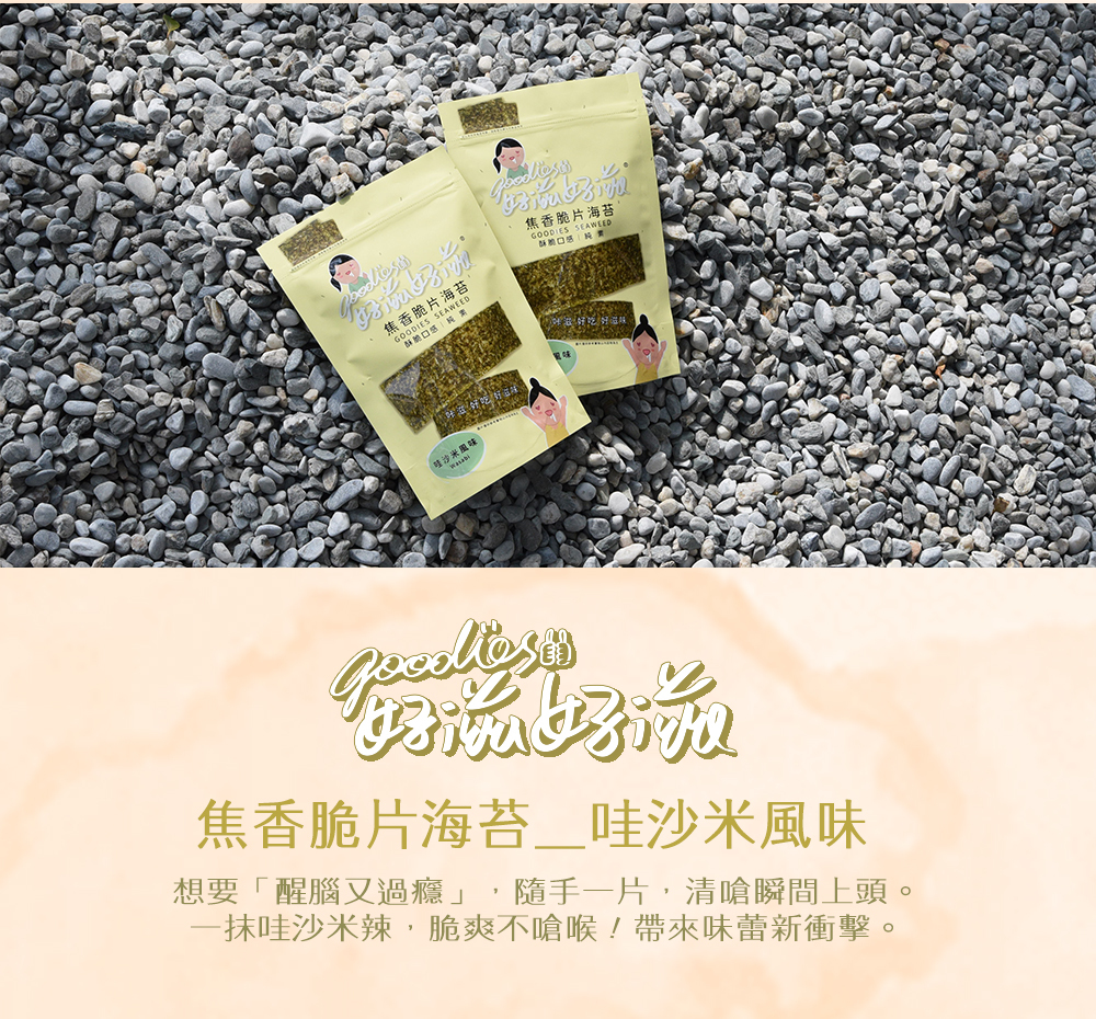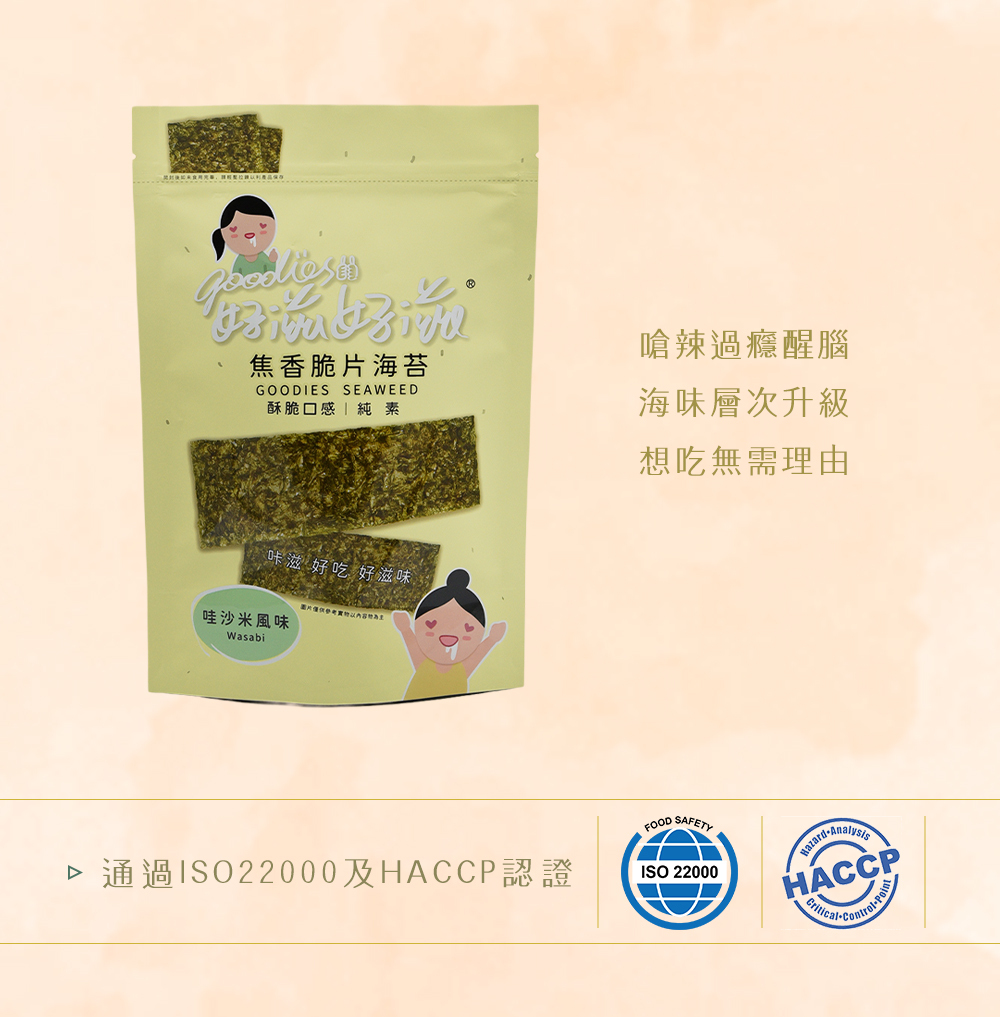 好滋好滋焦香脆片海苔嚴選特級初摘海苔,採用特製甩油處理,超脆不油膩、不粘牙。哇沙米風味海苔,鮮嫩酥脆、微嗆的清爽口感,無論配飯或當零食都超對味。健康又美味,好滋好滋焦香脆片海苔-哇沙米風味是嘴饞時的最佳選擇。